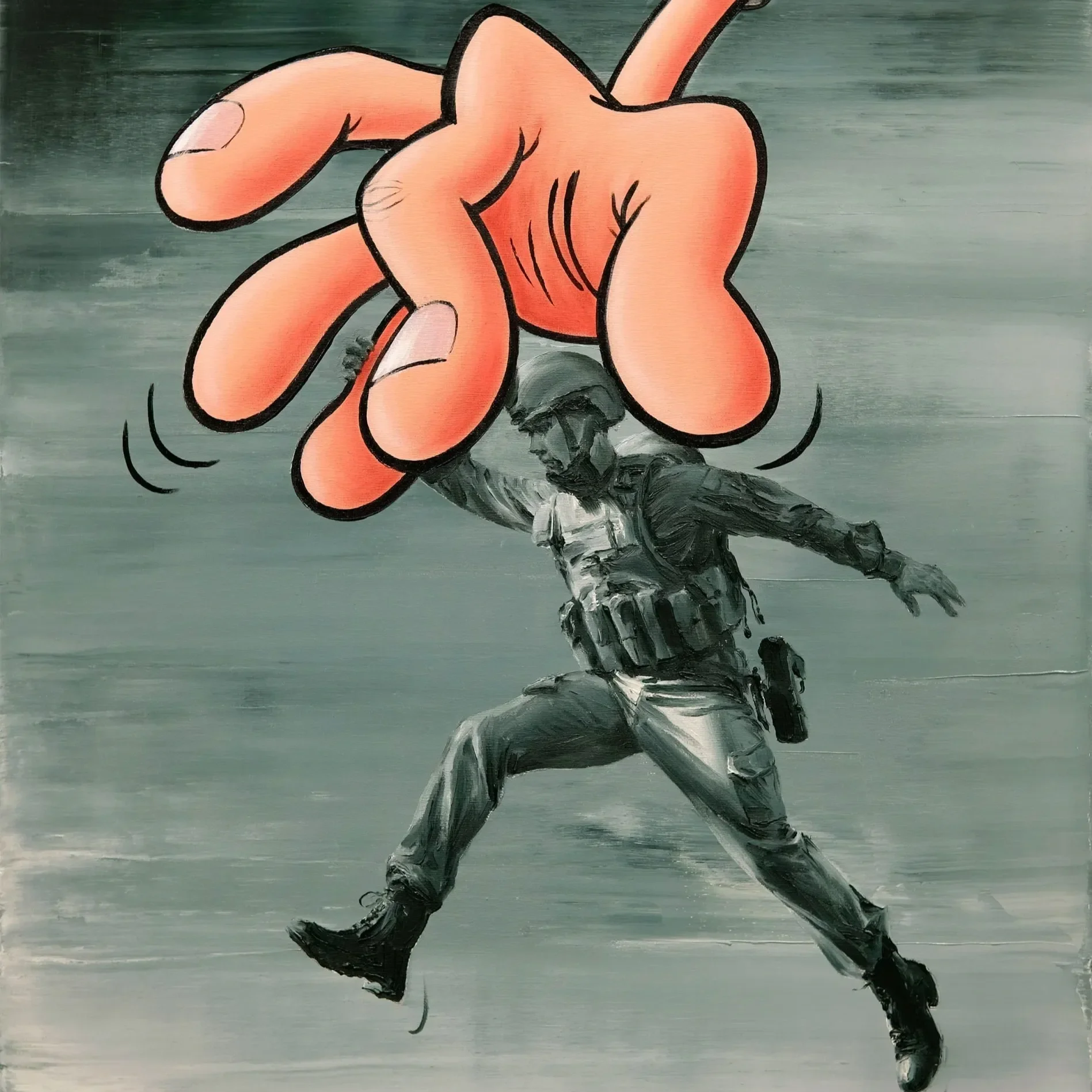 Titled Far Right Jab and Pawn, the paintings—executed in oil, acrylic, and marker on canvas—feature Pomet’s signature fusion of sharp realism and cartoon-like elements, creating a surreal yet humorous tension that defines his distinctive visual language.
